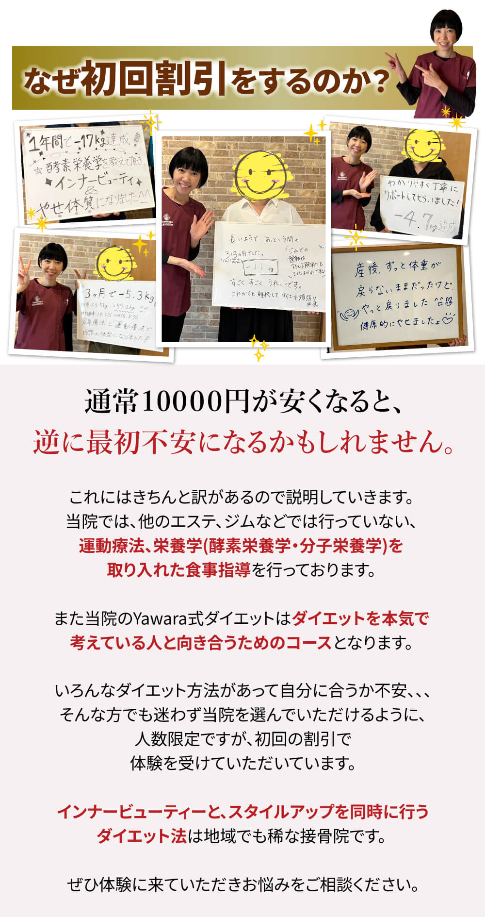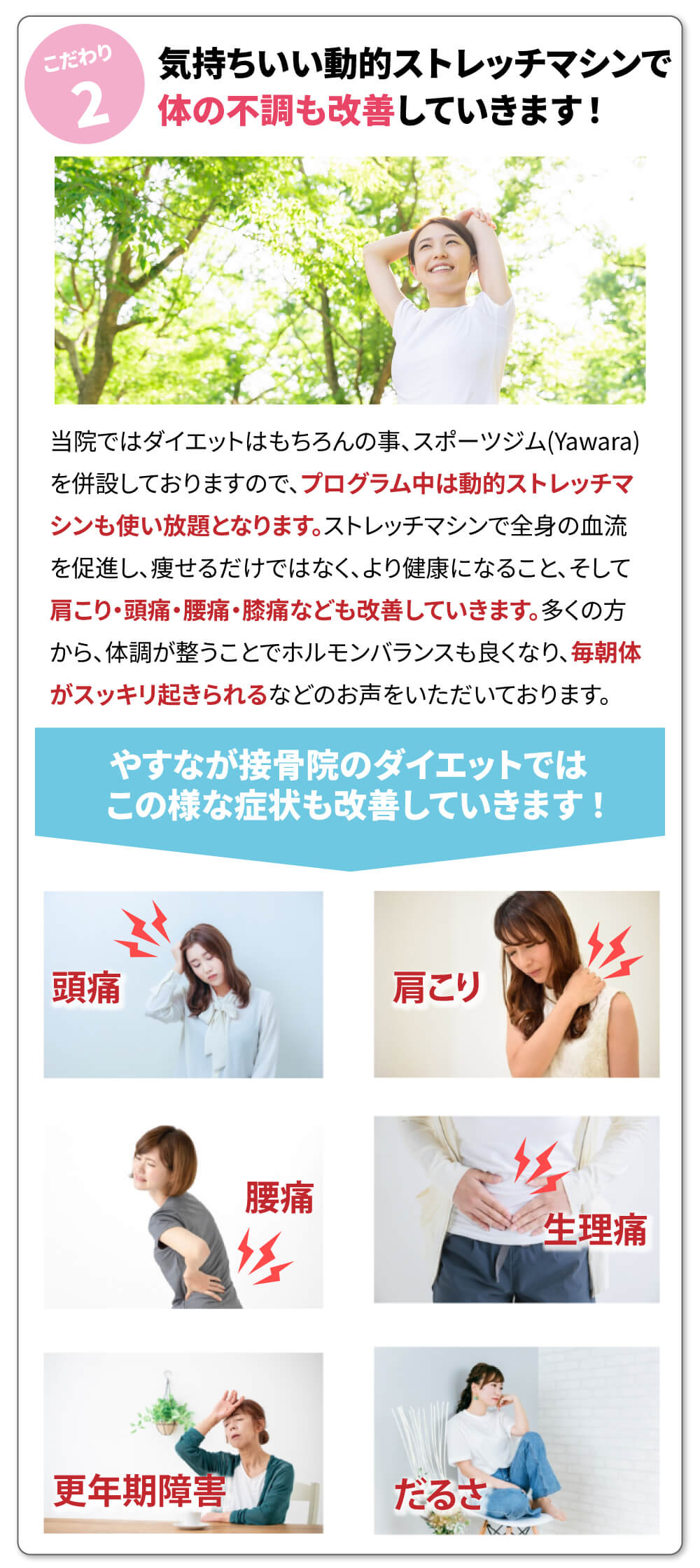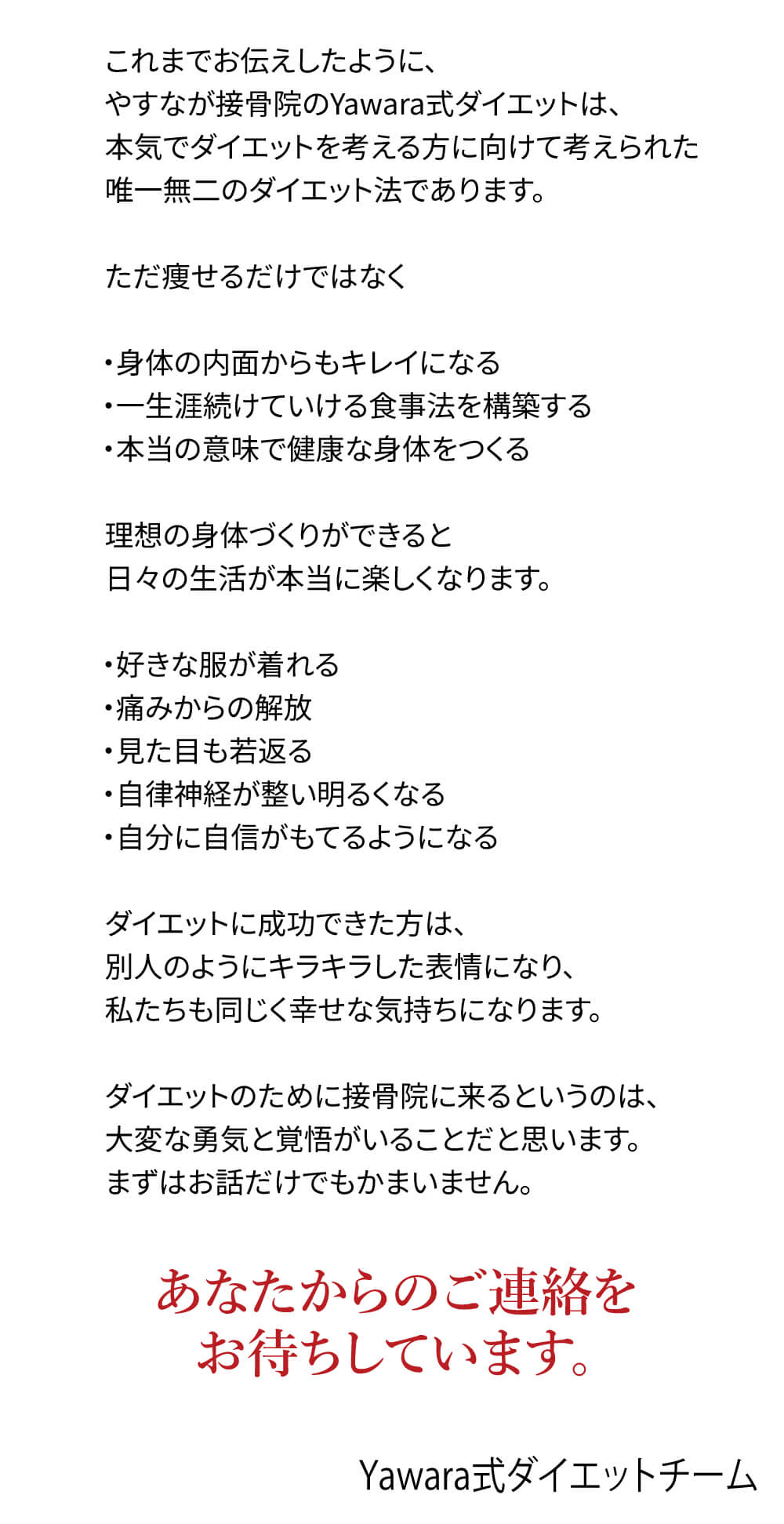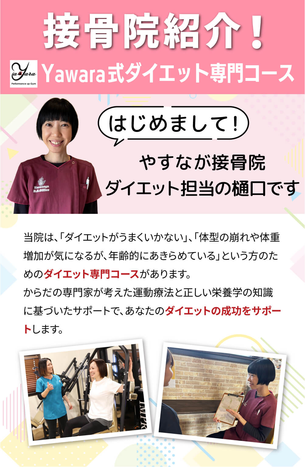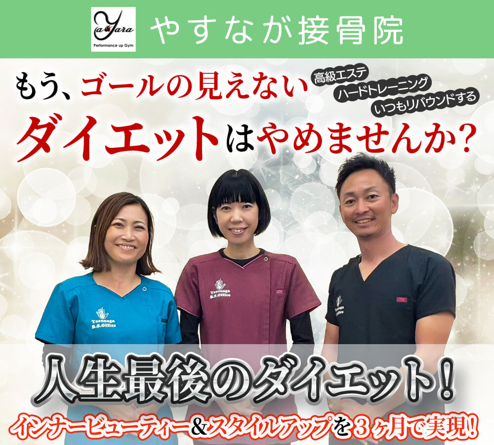 やすなが接骨院のYawara式ダイエットのホームページに起こしくださり、ありがとうございます。当院は「ダイエットがうまくいかない」「体型の崩れや体重増加が気になるが、年齢的にあきらめいる」という方のためのダイエット専門治療院です。