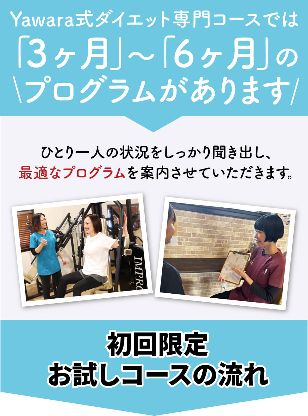 Yawara式ダイエットでは、運動をしなくても痩せれるように作られておりますが、更に上のボディメイクを目指す方には、身体の専門家ならではの運動療法を提案します。