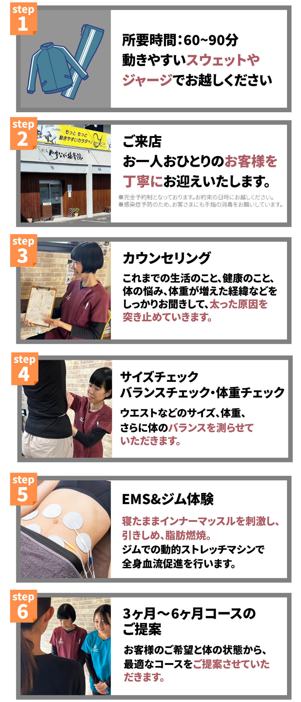 気持ちいい運動療法(動的ストレッチマシン)と並行して、ダイエットの正しい知識を身につけていただき日々の実践で減量していっていただきます。