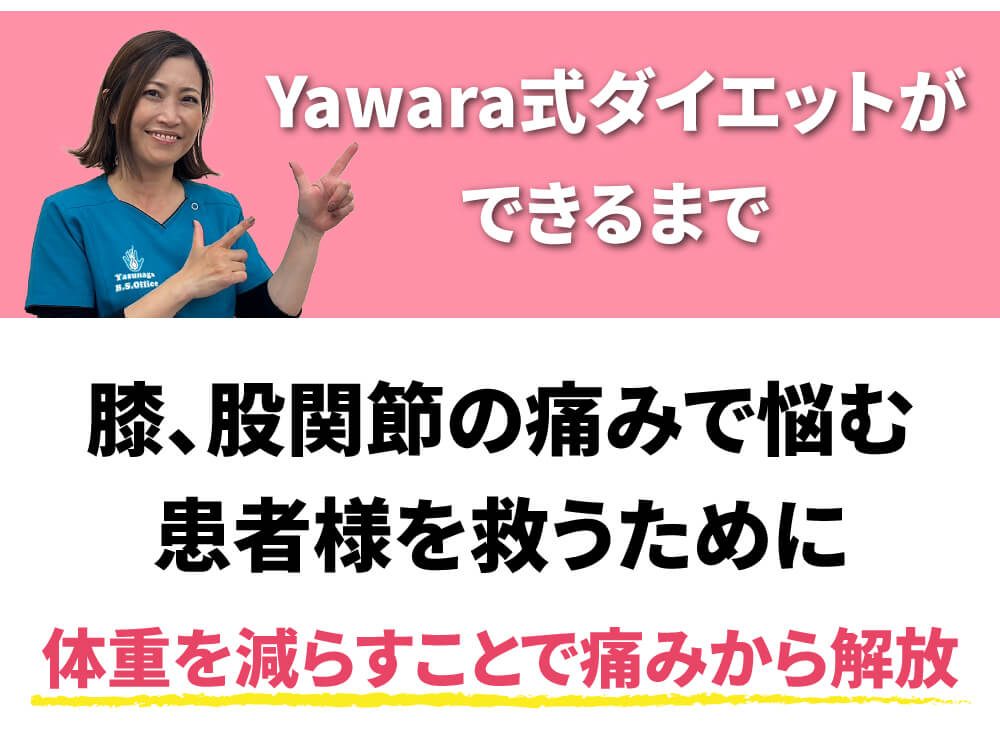 やすなが接骨院では、日々様々な症状の方が来院されます。その中でも、膝、股関節の痛みで悩む方は少なくありません。軽度の方は治療を行っていくことで改善されます。ですが、変形性関節症などの症状の強い方は簡単にはいきません。何とか症状を軽減される為に考えられたのが、Yawara式ダイエットの始まりです。